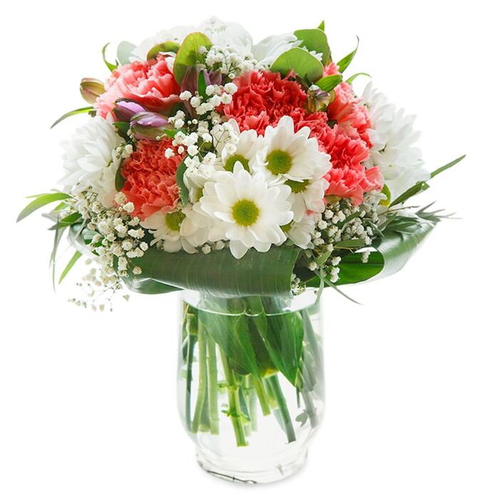 Illuminate any occasion with our radiant bouquet, featuring a stunning combination of snow-white chrysanthemums, delicate gypsophila, and light pink carnations. Wrapped in lush aspidistra leaves, this arrangement is both elegant and unique.